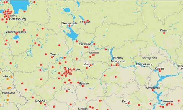И большая их часть нацелена на российские города. Судя по опубликованным картам, Вашингтон видит приоритетными направлениями все крупные мегаполисы РФ — точками на карте ниже обозначены прямые цели. Круги – это моделирование 3-х ядерных ударов по Москве, Питеру и Минску, который американцы также рассматривают в качестве цели.