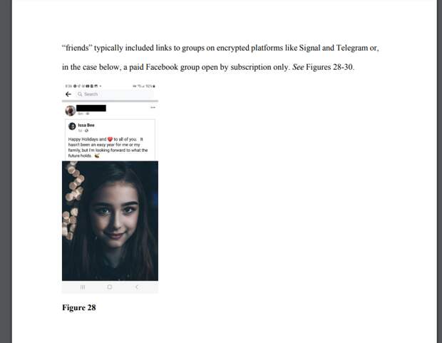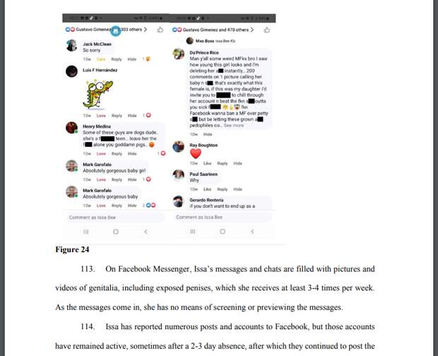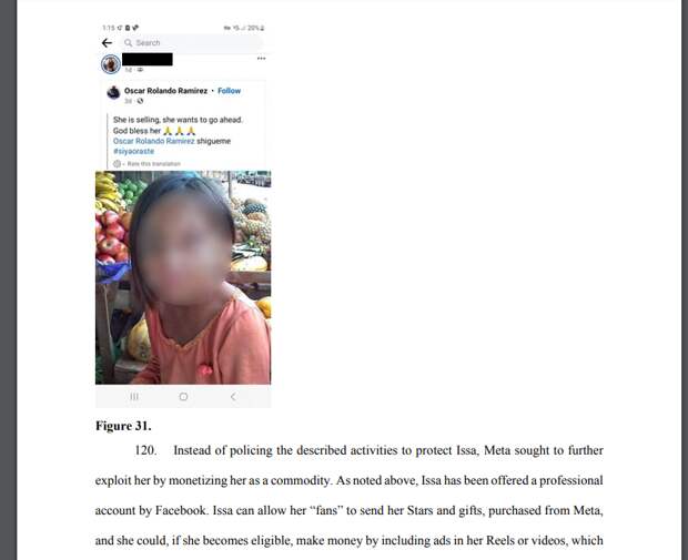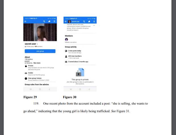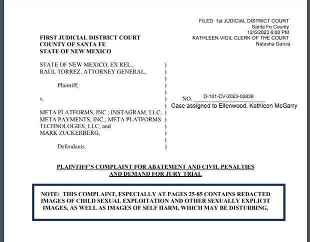 Следователи Управления обнаружили, что определенный контент, эксплуатирующий детей, более чем в десять раз более распространен в Facebook и Instagram, чем на Pornhub и OnlyFans. Более того, хотя изображения и тематические исследования, включенные в жалобу, шокируют, Генеральная прокуратура Нью-Мексико исключила из жалобы многие изображения, которые следователи нашли на платформах Meta, поскольку они были сочтены слишком наглядными и тревожными. Тем не менее, жалоба начинается с предупреждения в виде черного ящика относительно включенных в него подвергнутых цензуре изображений откровенно сексуального характера и изображений членовредительства. Родителям и детям, которые столкнулись с сексуальной эксплуатацией, ставшей возможной благодаря платформам социальных сетей, а также тем, кто испытал зависимость, депрессию, расстройства пищевого поведения или другие проблемы членовредительства или психического здоровья из-за использования социальных сетей, рекомендуется высказаться, поделиться своим опытом с Генеральной прокуратурой."