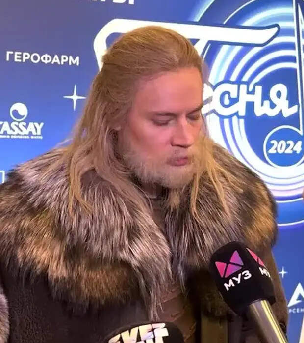 В шубе, с длинными волосами и наклеенной бородой с усами. То ли в образе викинга, то ли русского богатыря. Многие посчитали, что он решил почеркнуть мужественность после обвинений от некоторых в пропагагде ЛГБТ - из-за выступлений в косичках и с подкрашенными глазами.