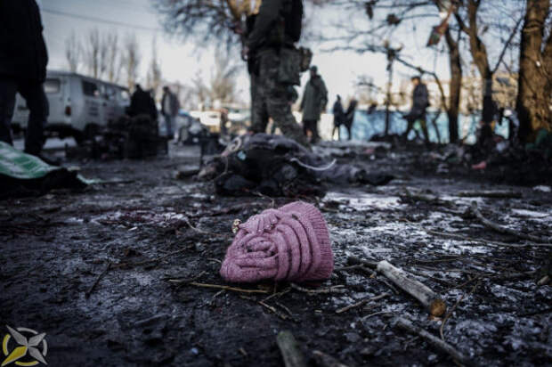 Главред издания "Донецкое время" Виктория Павлова: "Сейчас зажму волю в кулак и поделюсь тем, что видела. Только вернулась с Текстильщика. Руки трясутся до сих пор. Перед глазами стоят разбросанные по асфальту мандарины. Много мандаринов. И мужчина. Он сидит на коленях и держит за руку женщину. Женщина мертва. А за прилавком, с которого слетели эти мандарины и всякая всячина, ещё три тела. И чуть поодаль ещё два. Перехожу дорогу к овощному, и здесь тела. На проезжей части и возле магазина. Кто-то стоял, чтобы перейти эту дорогу. Перекрёсток, движение здесь всегда интенсивное, в рыночные дни — особенно. Подъезжает скорая — не помню, какая по счёту. Кричат: «Сюда, сюда». Вывозят носилки, грузят парня. Он в шоке, приподнял голову. На лбу запёкшаяся кровь. Реанимобиль с мигалками уезжает. Следом подъезжает следующий. И снова стоны, и снова крики со всех сторон: «Сюда, сюда». Куда не повернёшь голову — везде тела. Ком у горла, слёзы на глазах. Не могу взять себя в руки, а мне ведь нужно работать. Как? Это же всё родное. Сколько раз я покупала лекарства в этой аптеке. На мне и сегодня кожаные берцы, которые я год назад приобрела в обувном магазине — в том, что в бывшем супермаркете Засядько. Мне страшно переходить дорогу к нему. Всё в дыму. Тела, тела. От бывшего засядьковского и до самого БУМа стоял стихийный рыночек. Торговали кто чем: зеленью, соленьями, картошкой, мёдом. Теперь вот лежат тела. Кто-то, как сидел на стульчике, так и упал с ним набок. Больше никогда не поднимется. У машины стонет мужчина. Он ранен. Все со всех сторон вызывают скорые. Военные аккуратно ступают среди лежащих на асфальте людей, проверяют пульс. Мёртвых накрывают, живых грузят в машины и везут в ближайшую больницу. Кричат люди. Простые прохожие, покупатели и продавцы. Мужчина из магазина пытается убрать битое стекло из двери. Руки трясутся, не слушаются его. Всё в пелене, всё в дыму. Вырываешься из дыма и снова натыкаешься на тела. «Ой, я же у этого дядечки мясо покупала», «А я здесь всегда творог и молочку брал», «У той женщины такие вкусные мандарины»... Мандарины разбросаны по асфальту. А женщины больше нет. Над её телом застыл мужчина. Держит за руку".