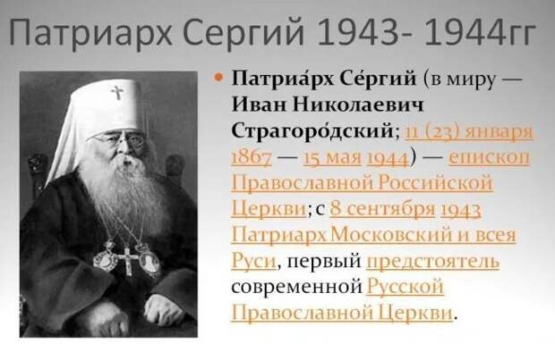 И ещё. 8 сентября 1943 года, через три дня после встречи И. Сталина с высшими иерархами Церкви, в Москве состоялся Архиерейский собор Русской Православной Церкви. Собор единогласно избрал митрополита Сергия патриархом Московским и всея Руси.