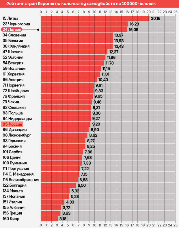 13 564 самоубийств в России, это смертность 9,2 на 100000 населения. 9,2 – это 85 место в мире по числу самоубийств.