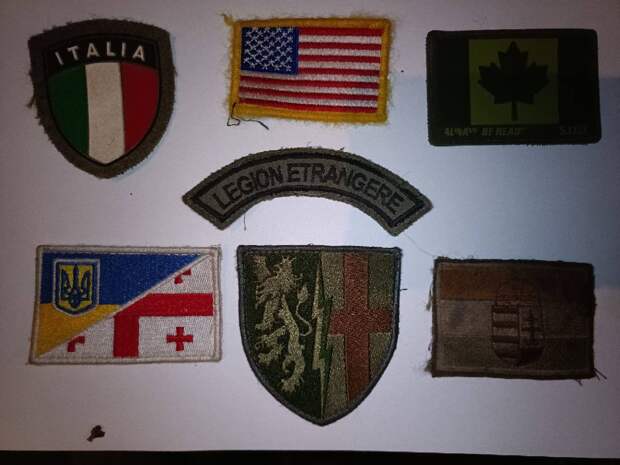 Шевроны были сняты с погибших или взятых в плен наемников. Первыми под ударами «музыкантов» пал Иностранный легион (Франция). Они стояли на окраинах Бахмута и поэтому полегли одними из первых. Позднее попались американцы, итальянцы, шведы, немцы, грузины, канадцы. Собственно, весь спектр иностранных наемников представлен на шевронах.