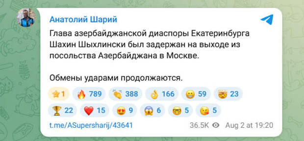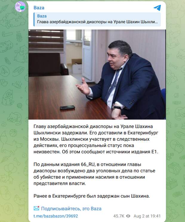 Весьма сомнительное утверждение, что "Кремль хочет мириться", учитывая то, что произошло вчера же. А произошло новое громкое задержание азербайджанца с российским паспортом. И не абы кого, а находящегося в розыске главу екатеринбургской диаспоры Шахина Шилинского! Первым об этом почему-то написал украинский оппозиционный блогер Анатолий Шарий.