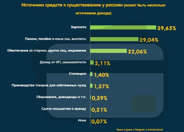 1. Россия является социальным государством, построенном на основе крепкой капиталистической экономике. 29% россиян получают пенсии, пособия и соцвыплаты, 22% живёт на иждивении у других лиц. Если сложить эти две цифры, то получится заметно больше, чем 39% россиян, живущих на зарплаты (ссылка).