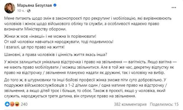«У женщин останется уникальная отсрочка и право на увольнение – беременность. Если беременная – не вправе мобилизовать/можешь уволиться. Но в то же время декретный отпуск как право на отсрочку/увольнение планируем предоставить как жене, так и мужу на выбор», – написала она.
