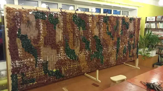 Технология плетения такова. На деревянный каркас натягивается дель - сеть, в ячейки которой вплетаются нарезанные определённым способом ленты защитных цветов из синтетического материала - спанбонда.