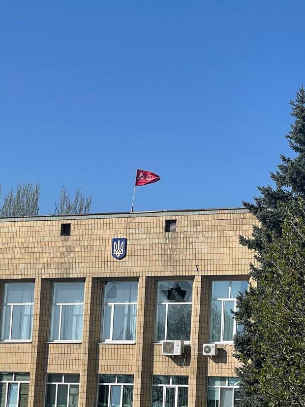 Сочетаемое несочетаемого в горсовете Васильевке. Украинский герб и советский флаг.