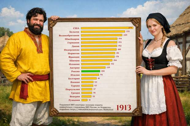 Цифры показывают, что в 1913 году «отсталая» Россия была немного богаче Италии и немного беднее Австрии. Это подписчики напомнили мне об убедительной статистике по ВВП на душу населения до революции 1917 года. Интересующимся темой рекомендую сохранить себе таблицы по ссылке, пока ЖЖ ещё жив. Конкретно от Германии мы в 1913 году отставали, хотя и не в разы, зато мы резко опережали Японию, были вдвое богаче Португалии, Греции и Венгрии. Повторюсь, это в пересчёте на душу населения, которое в России было тогда преимущественно крестьянским.