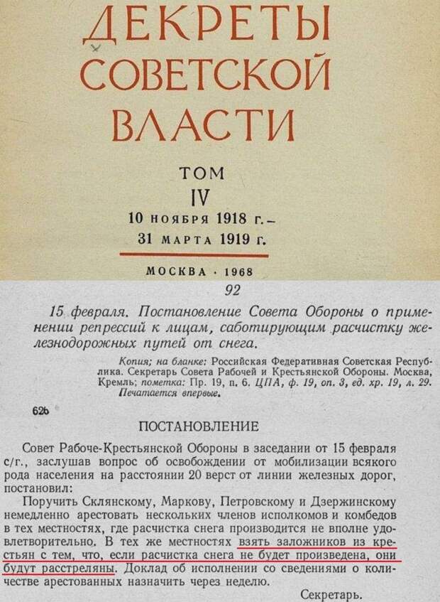 1. Революцию 1917 называют «рабоче-крестьянской», однако это не вполне верно. Рабочие среди революционеров были, но вот крестьян Ленин со Сталиным считали врагами: они называли их «последним буржуазным классом», то есть классом мелких собственников, с которым им следовало вести борьбу. Прикрепляю к посту характерный документ эпохи — советская власть решает вопрос очистки снега с железных дорог. Большевики приказывают исполнителям на местах брать заложников из числа крестьян, и если другие крестьяне будут чистить снег плохо, то расстреливать заложников.