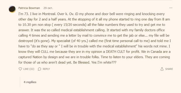 "Мне 73 года. Я живу в Монреале. Мой телефон и дверной звонок звонили и стучали через день в течение двух с половиной лет. В один прекрасный день телефон начал звонить с 8:00 до 22:30 без перерыва (каждые 15-20 секунд). Звонили по всем номерам, чтобы заставить меня ответить. Звонили из так называемого медицинского учреждения. Всё началось с того, что мне звонили четыре раза из кабинета семейного врача и прислали письмо по почте, убеждая сделать укол[самоубиться], иначе... моё дело[мед. карта] будет уничтожено (оно утеряно). Мой врач (ему 40 лет) позвонил мне (это был мой первый личный разговор) и сказал, что я должна "делать[умереть], как они говорят, иначе у меня будут проблемы с медицинским сообществом". Это его слова, не мои. Я знаю, что они меня ВЫБРАКОВЫВАЮТ, потому что, по моему мнению, они — КУЛЬТ СМЕРТИ, созданный ради прибыли. Мы в Канаде — захваченная нация, и у нас проблемы, ребята. Пора прислушаться к старшим. Они идут за теми из нас, кто ещё жив. Будьте благословенны. И да, я белая!"