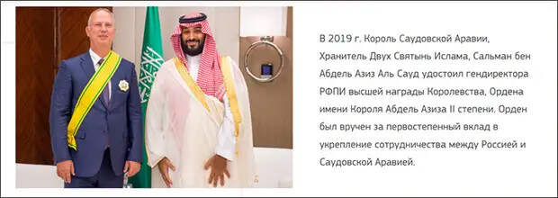 А вот это - особо важная награда, в свете произошедших событий. Год спустя Дмитриев удостоился высшей награды Саудовской Аравии — ордена имени Короля Абдель Азиза II степени. Орден был вручён за первостепенный вклад в укрепление сотрудничества между Россией и Саудовской Аравией.
