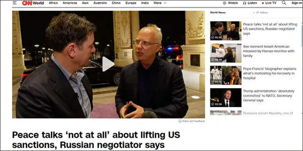 В быстром интервью CNN "на ногах" после переговоров с американскими представителями Дмитриев заявил о важности "возведения мостов" в отношениях США и России, а также назвал самого Дональда Трампа и его делегацию "отличными решателями проблем". Дмитриев также отметил, что компании США из-за санкций против России потеряли 300 млрд долларов — больше, чем потеряла Россия.