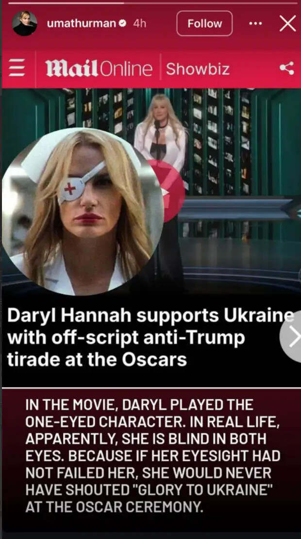 "В фильме Дэрил играла одноглазую героиню. В жизни, видимо, она ослепла на оба глаза. Потому что, если бы зрение её не подводило, она никогда бы не выкрикнула [лозунг националистов] на церемонии "Оскар", - написала Ума Турман в соцсетях.