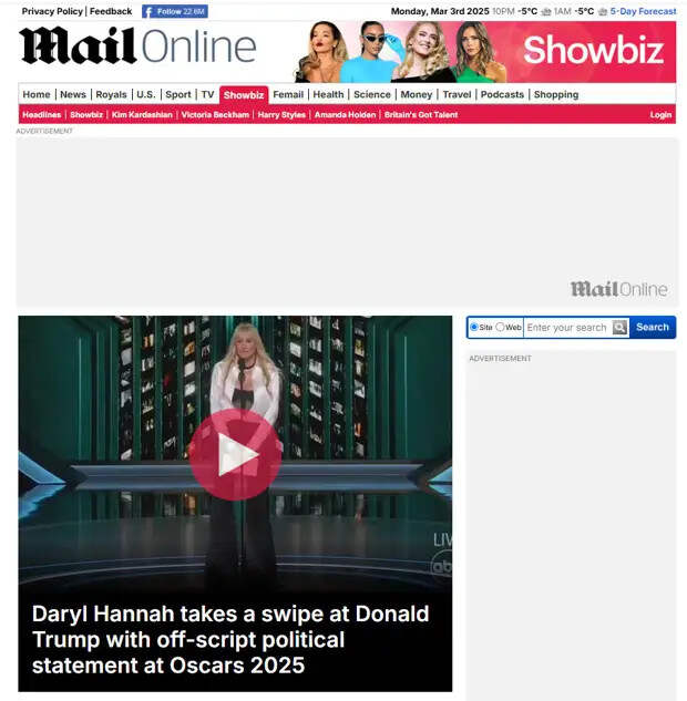 Британская Daily Mail сообщила, что ведущая 97-й церемонии вручения "Оскара" Дэрил Ханна, отдавая дань уважения Украине, позволила себе политическое заявление, не предусмотренное сценарием.