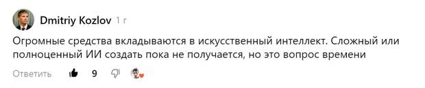 В реальности мы знаем, что произошло. Через полгода после публикации того моего поста, в ноябре 2022, в публичный доступ вышел ЧатЖПТ — пока что ещё слабый, но зато универсальный искусственный интеллект, способный почти по-человечески обсуждать самый широкий круг вопросов. Многие читатели предсказывали развитие узких нейросетей, которые будут лучше рисовать картинки или распознавать речь, но появление конкретно ЧатаЖПТ предсказал только Дмитрий Козлов с Дзена: