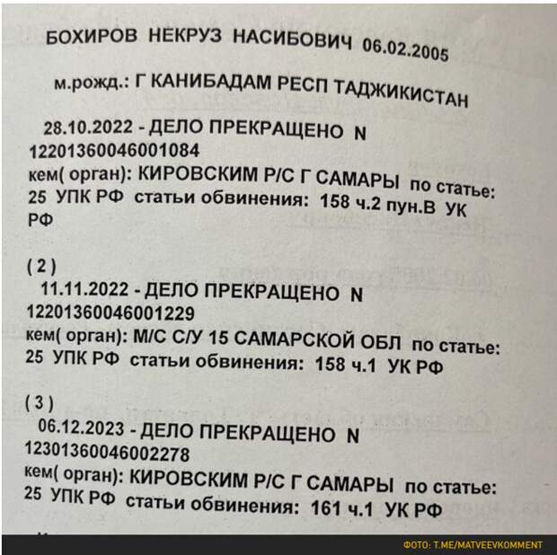 Напомним, мигрант из Таджикистана Некруз Бохиров недавно получил паспорт гражданина нашей страны, при этом имея за плечами три уголовных дела: два - за кражи и одно - за грабёж. Тем не менее каждое из этих дел было закрыто самарским судом "за примирением сторон".
