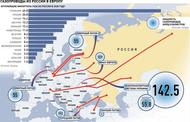 По добыче газа в Европе лидирует Россия, а по потреблению — ЕС. Рынок газа Евросоюза дефицитен, и этот дефицит возрастает, увеличившись с 232 миллиардов кубометров в 2014 году до 343 миллиардов кубометров в 2020-м.