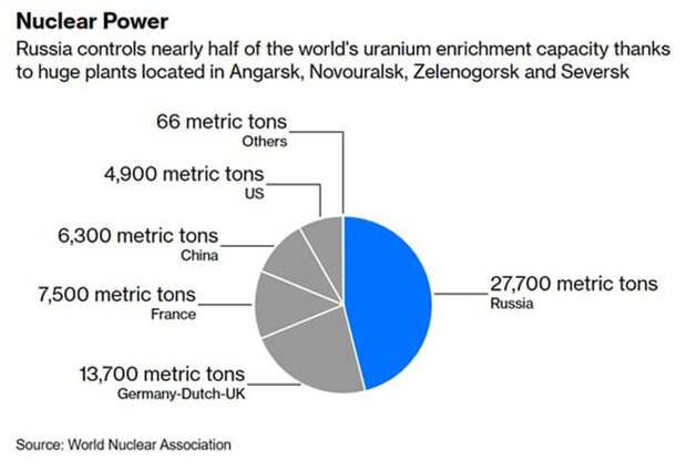 1. Россия контролирует почти половину мирового рынка обогащения урана, без которого невозможно производство ядерного топлива – см. синий сектор на заглавном графике. На Западе сильно расстраиваются из-за этого (ссылка):