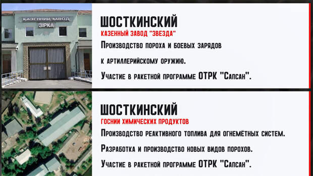 Второй объект - Павлоградский механический завод (ПМЗ). Предназначался для сборки корпусов ракет, двигательных установок, систем управления и боевых частей ОТРК. Далее - Шосткинский казённый завод "Звезда", Сумская область. Там велось производство пороха и зарядов. Последним объектом стал Шосткинский государственный научно-исследовательский институт химических продуктов на Сумщине.
