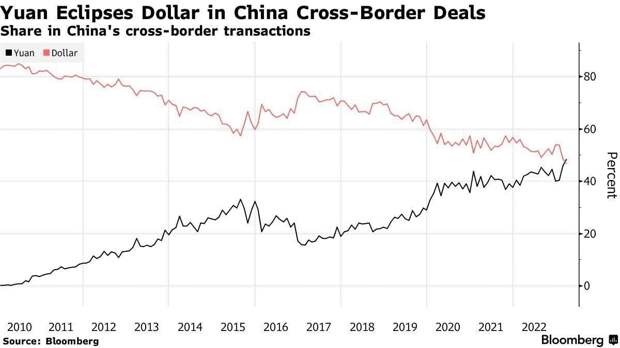 1. Важная веха в отказе мира от доллара. Дедолларизация во внешних расчётах Китая перевалила за экватор — событие, которое ещё 15 лет назад посчитали бы до смехотворности невероятным (ссылка):
