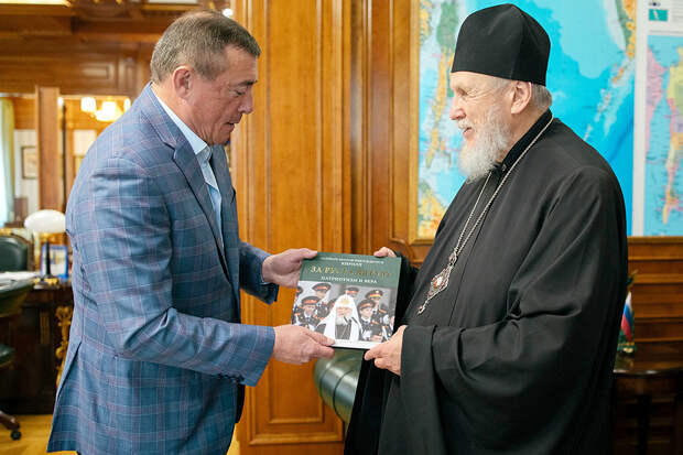 В ходе рабочей поездки состоялась встреча с губернатором Сахалинской области В.И Лимаренко. Епископ Николай рассказал главе региона о работе издательства и передал новые книги Святейшего Патриарха Кирилла, подготовленные Издательством Московской Патриархии".