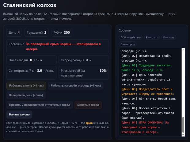 Я хочу, чтобы ты сделал игру, суть такова. Называется «Сталинский колхоз». Игрок играет за работника колхоза. Главное действие — работать в поле. Кнопка «работать в поле» проматывает 1 час. Нажал кнопку 12 раз, день закончился, получил галочку «трудодень». Если не отработал трудодень, то на первый раз председатель кричит или угрожает. Если повторно не выполняешь норму, то появляется риск угодить в лагерь. Если колхозник отправляется в лагерь, игра заканчивается.